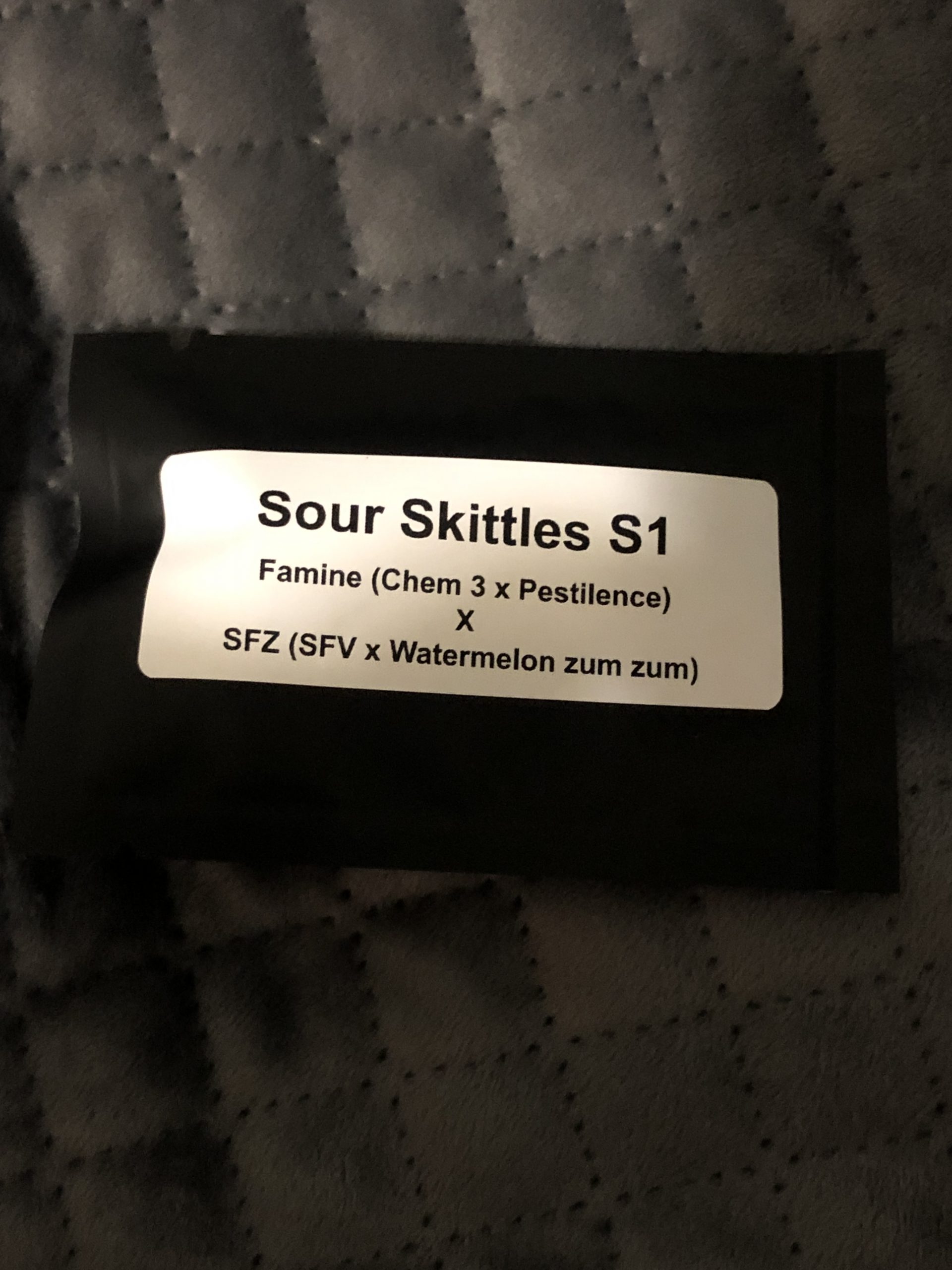 Genetic breakdown for Sour Skittles is (Famine x SFZ). Famine is from Inkognyto and it is a cross of (Chem 3 x Pestilence). SFZ is (San Fernando Valley OG Kush x Watermelon Zum Zum). Full breakdown of this strain is: ((Chem 3 x Pestilence) x (SFV x Watermelon Zum Zum)) X ((Chem 3 x Pestilence) x (SFV x Watermelon Zum Zum))
